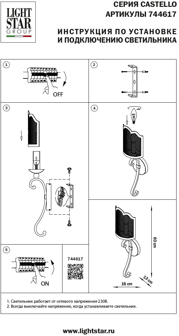 Бра Lightstar Castello 744617Характеристики