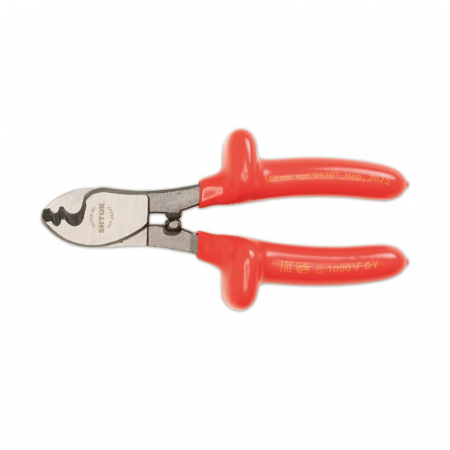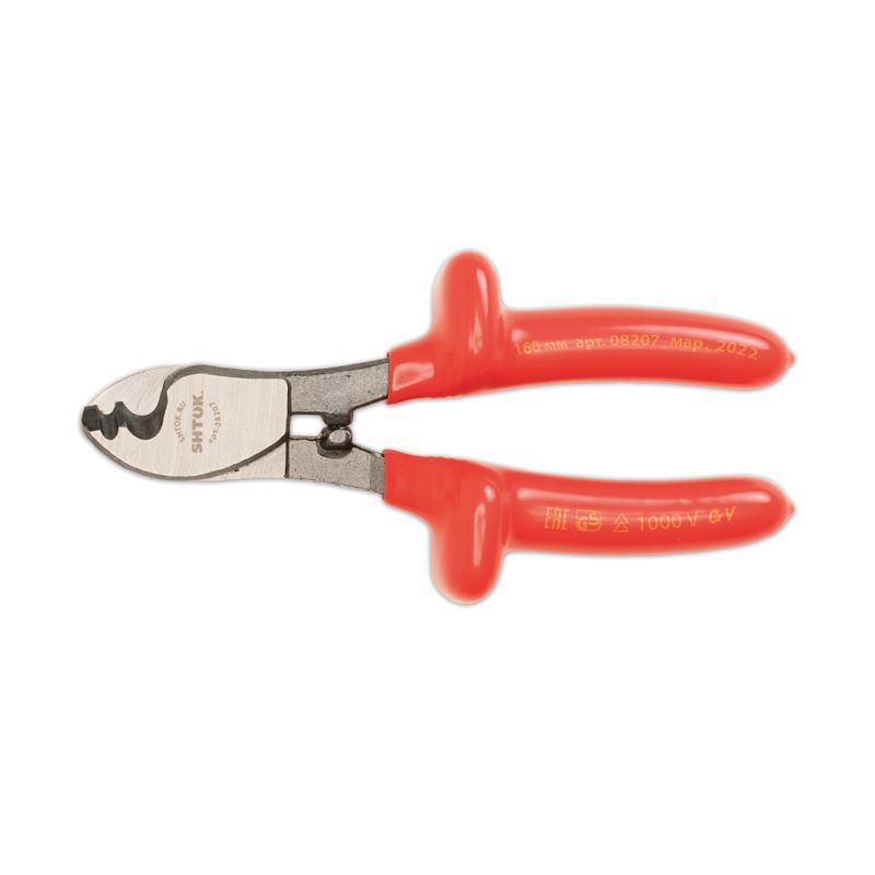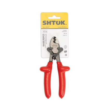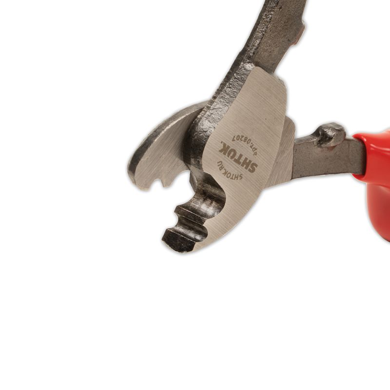 Диэлектрический кабелерез SHTOK 08207 используется для работы под напряжением. Инструмент выполнен из стали и оснащен удобными рукоятками. Предусмотрены специальные упоры на рукоятках для надежности удержания инструмента во время работы.Особенности кабелереза SHTOK 08207