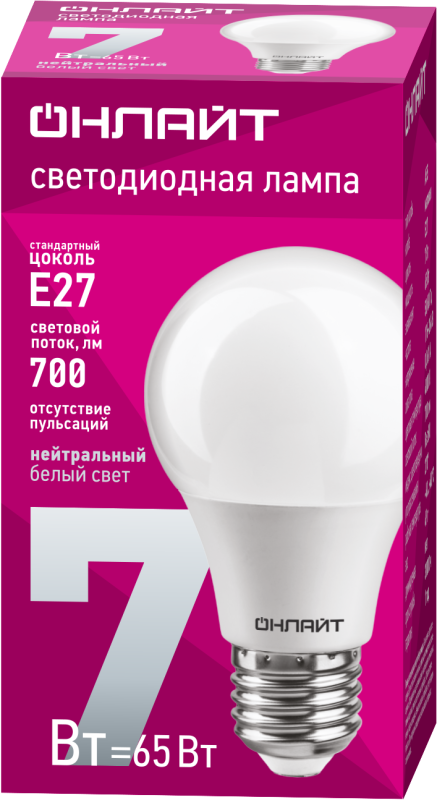 Лампа светодиодная 71 648 OLL-A60-7-230-4K-E27 ОНЛАЙТ 4670004716489 – лампа с шаровидной колбой, длиной 73 мм, с цоколем Е27, мощностью 7 Вт. Цветовая температура 4000 К. Дает нейтральный белый свет.Характеристики