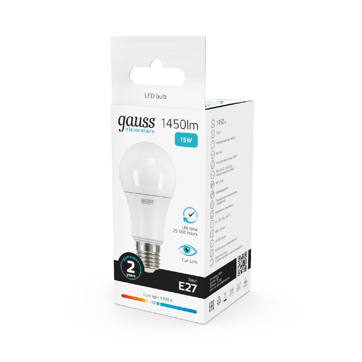Лампа cветодиодная Gauss E27 15W 4100K груша матовая 23225Характеристики