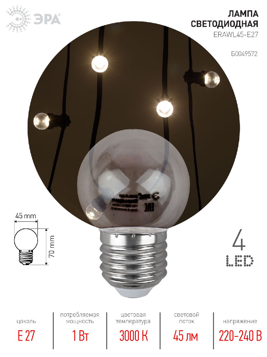 Лампа светодиодная Эра E27 1W 3000K ERAWL45-E27 Б0049572Характеристики