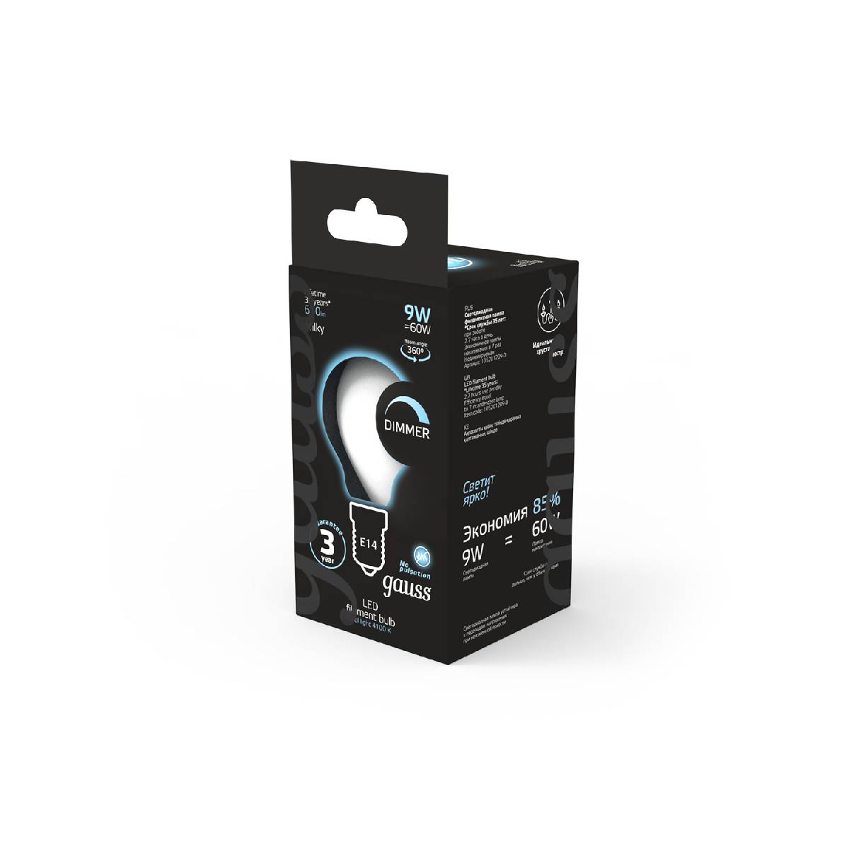 Лампа светодиодная филаментная диммируемая Gauss E14 9W 4100К матовая 105201209-DХарактеристики