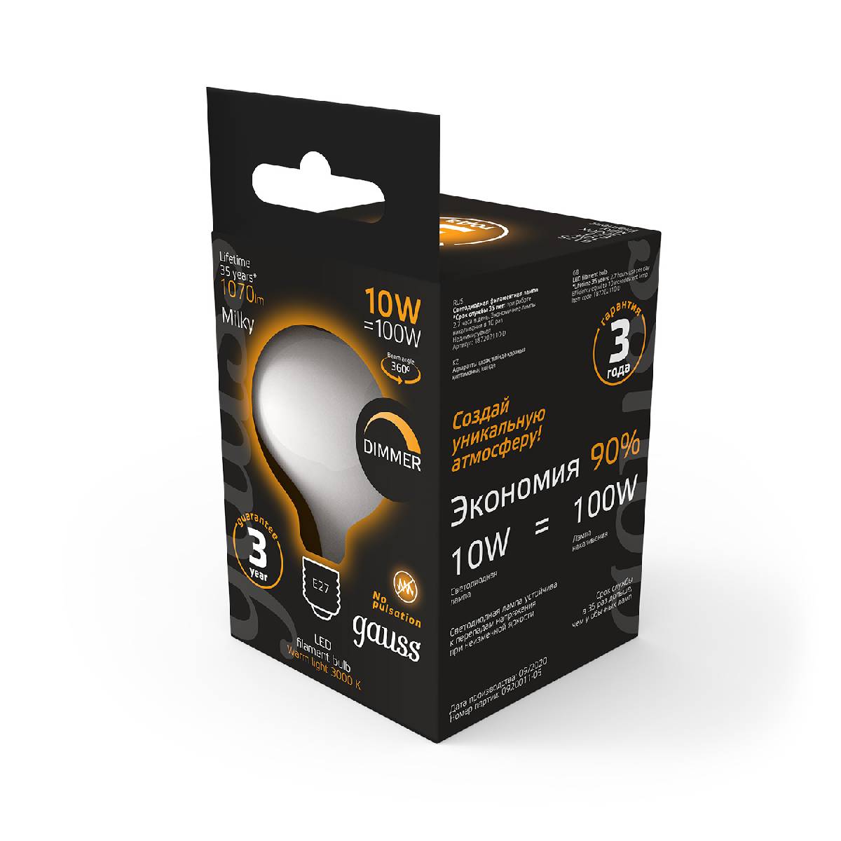Лампа светодиодная филаментная диммируемая Gauss E27 10W 3000К матовая 187202110-DХарактеристики