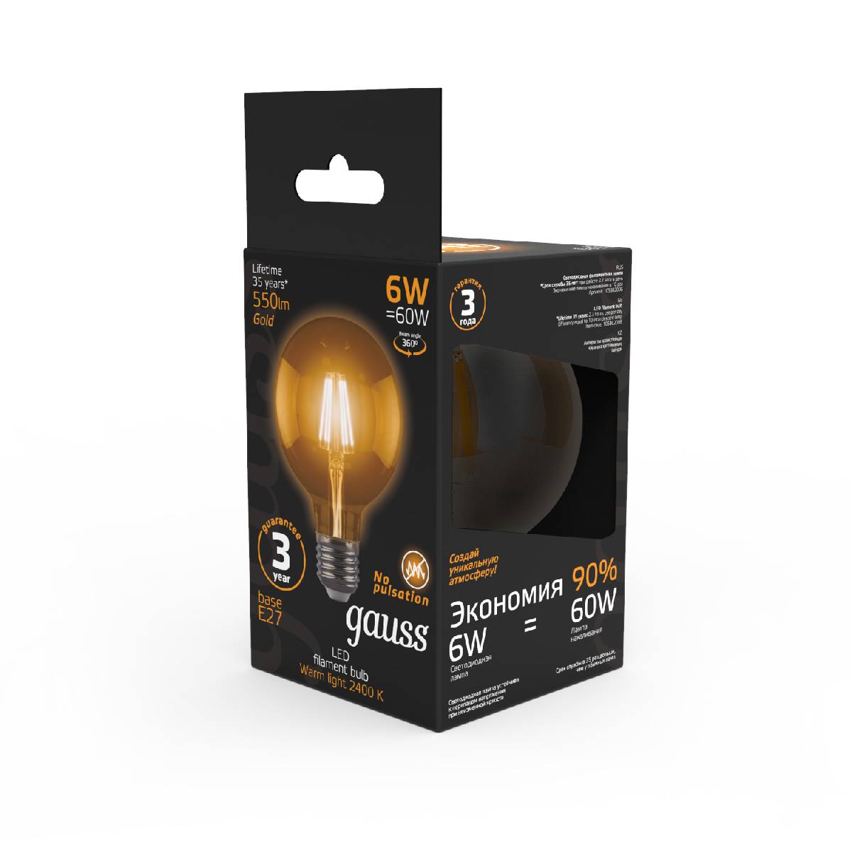 Лампа светодиодная филаментная Gauss E27 6W 2400K прозрачная 105802006Характеристики