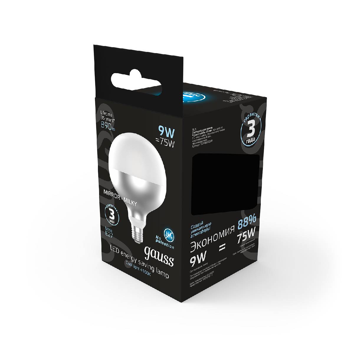 Лампа светодиодная филаментная Gauss E27 9W 4100K шар белый 1014802209Характеристики