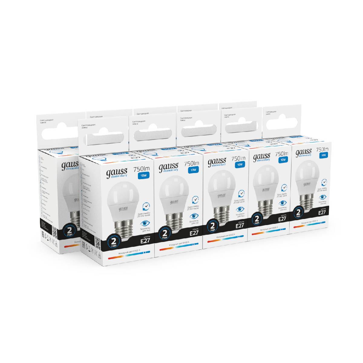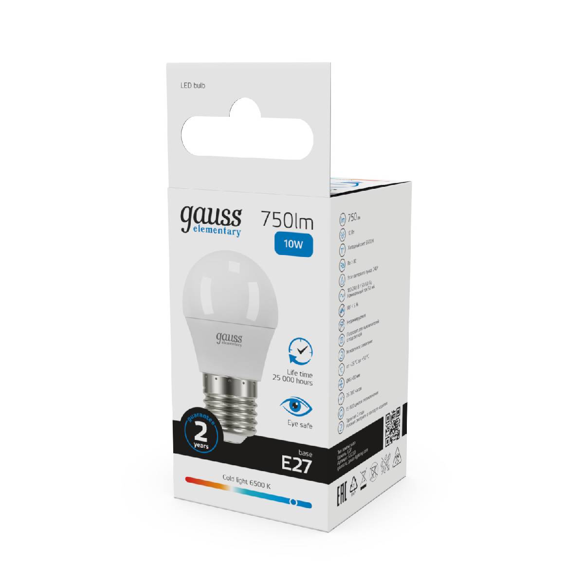 Лампа светодиодная Gauss E27 10W 6500K шар матовый 53230Характеристики