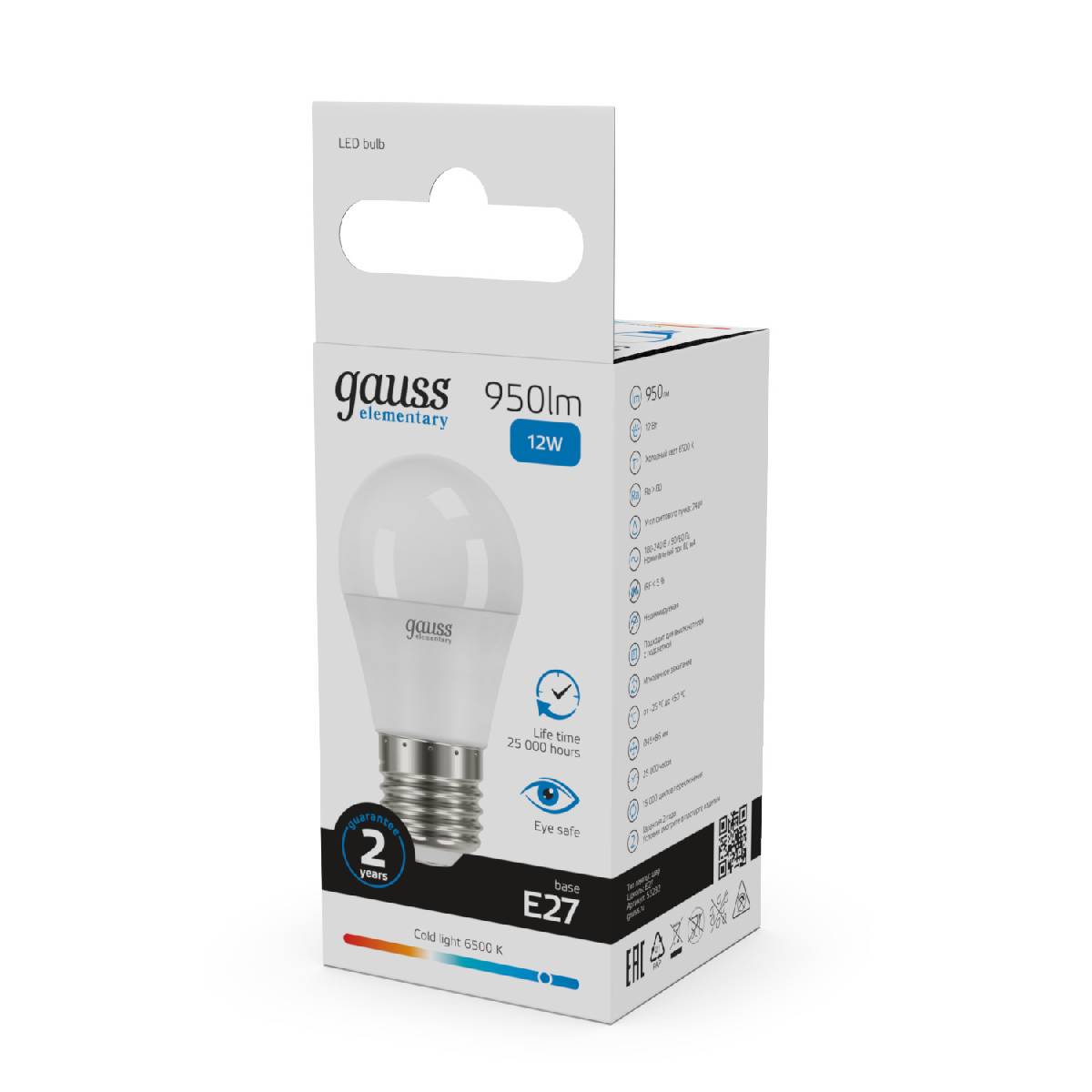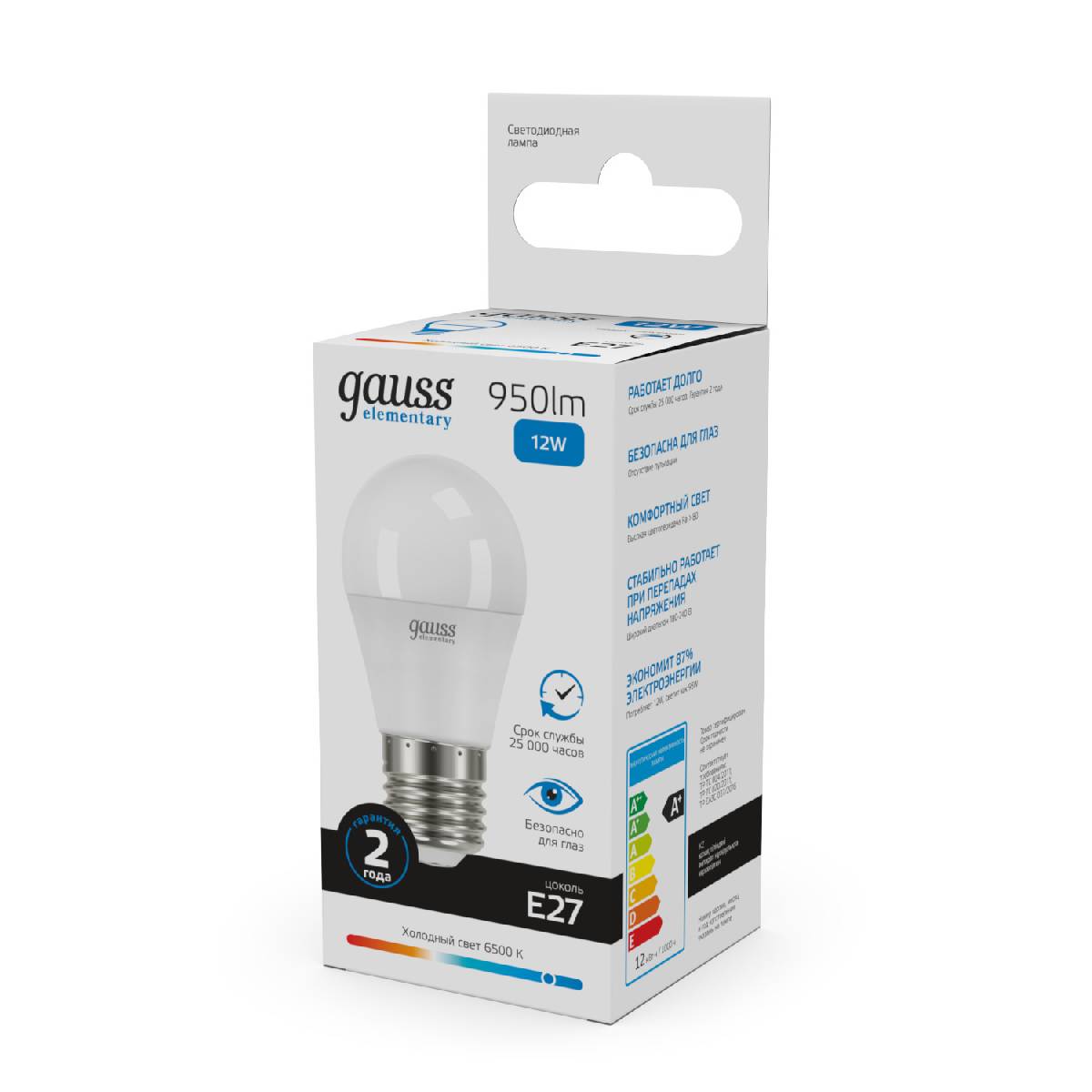 Лампа светодиодная Gauss E27 12W 6500K шар матовый 53232Характеристики