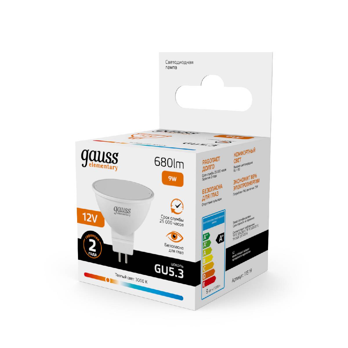 Лампа светодиодная Gauss Elementary GU5.3 9W 3000K 11519Характеристики
