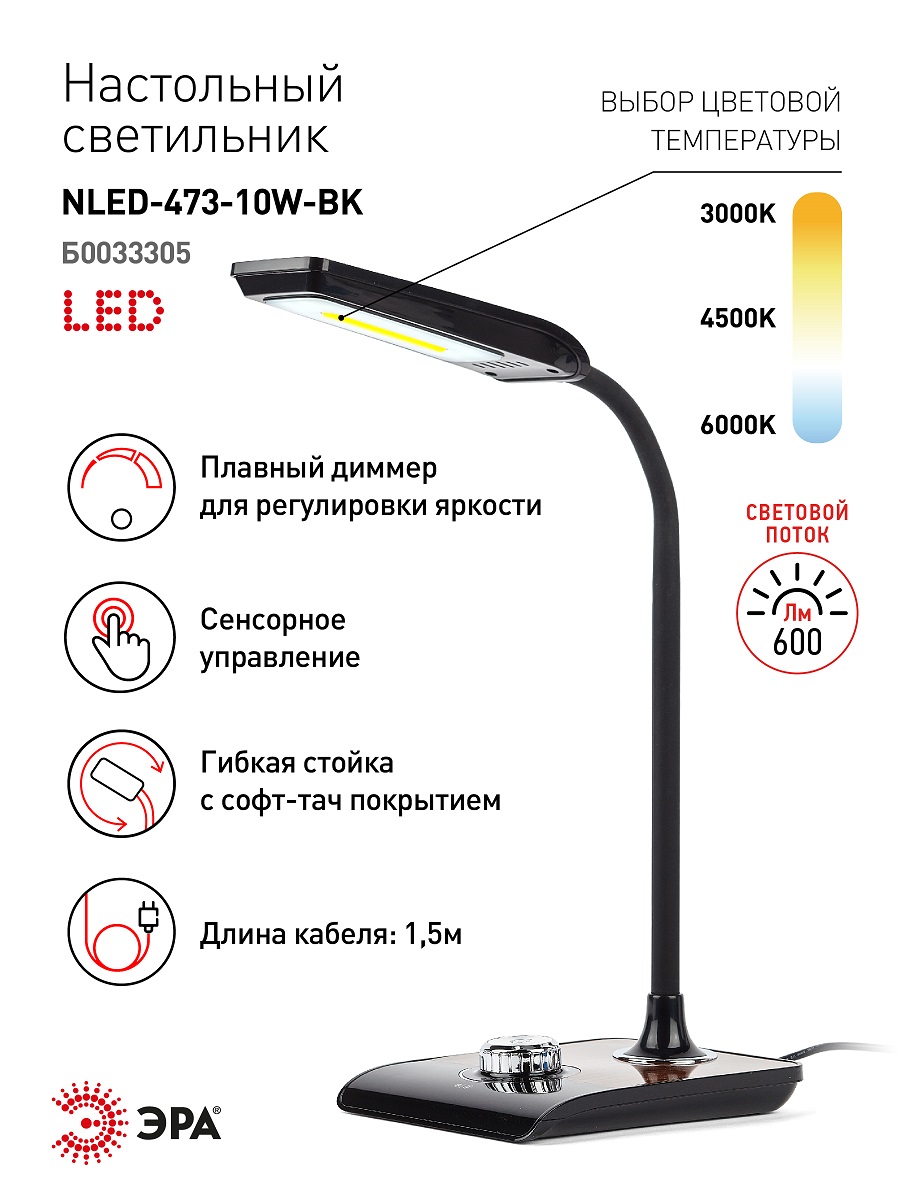 Настольная лампа ЭРА NLED-473-10W-BK Б0033305Характеристики
