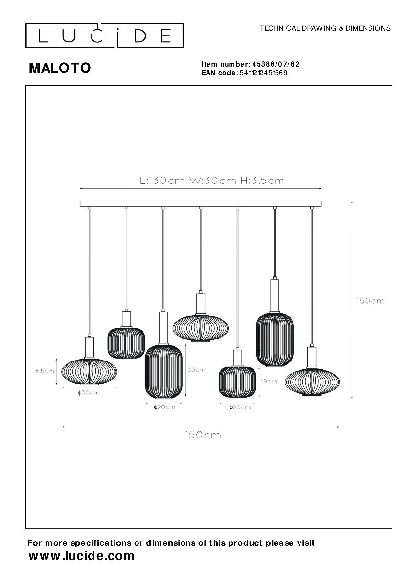 Подвесная люстра Lucide Maloto 45386/07/62Характеристики