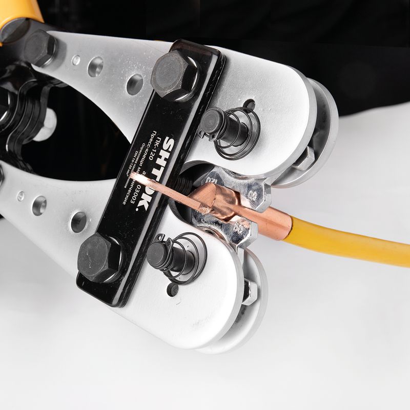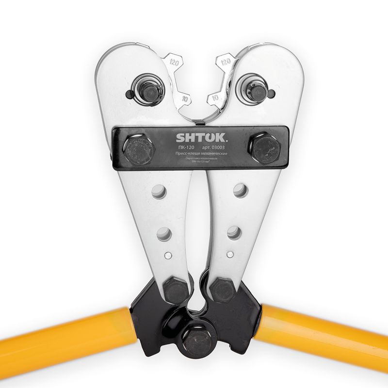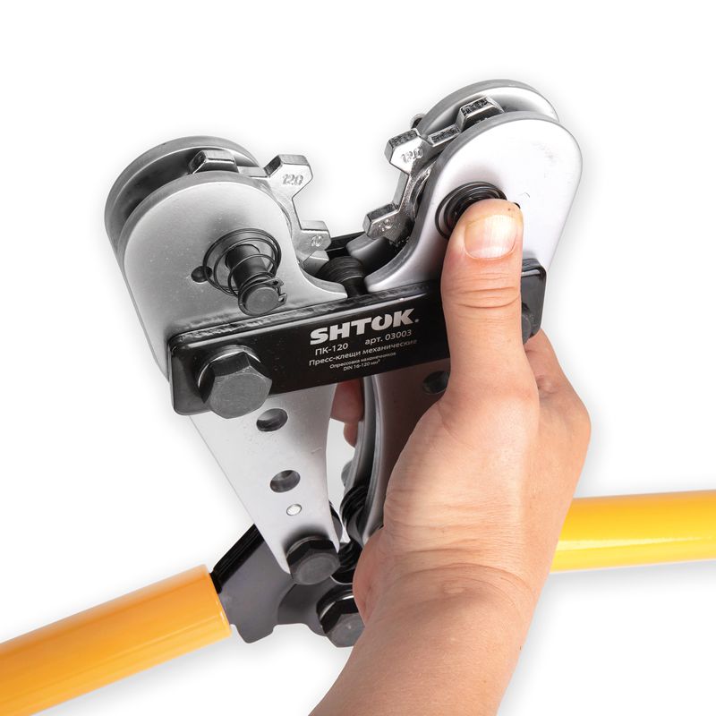 Особая конструкция ручных гидравлических пресс-клещей SHTOK ПК-120 03003 плотно зажимает кабель, не давая ему ""выйти"" из рабочей области. Минимальная площадь опрессовки 16 мм.