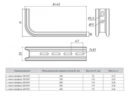 "Омега профили предназначены для легких нагрузок и могут быть смонтированы как к стене, так и к потолку. Они обеспечивают надежный и быстрый монтаж металлических кабельных лотков любой ширины. Имеют удобную перфорацию под анкерные болты или шпильки М10. Стандартная толщина профилей - 1,5 мм.Кабельные лотки EKF-Line крепятся к профилям стандартным комплектом метизов wgm6x16."