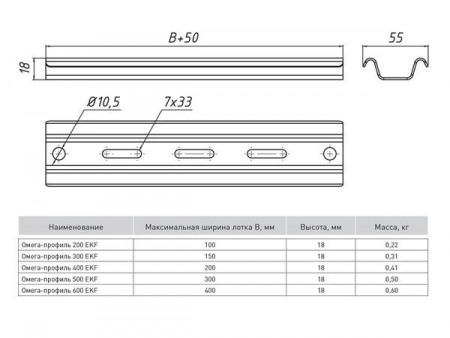"Омега профили предназначены для легких нагрузок и могут быть смонтированы как к стене, так и к потолку. Они обеспечивают надежный и быстрый монтаж металлических кабельных лотков любой ширины. Имеют удобную перфорацию под анкерные болты или шпильки М10. Стандартная толщина профилей - 1,5 мм.Кабельные лотки EKF-Line крепятся к профилям стандартным комплектом метизов wgm6x16."