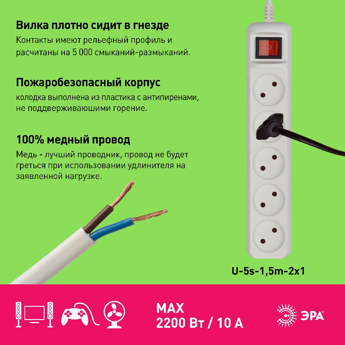 Удлинитель электрический Эра U-5s-1,5m-2x1 Б0044055Характеристики