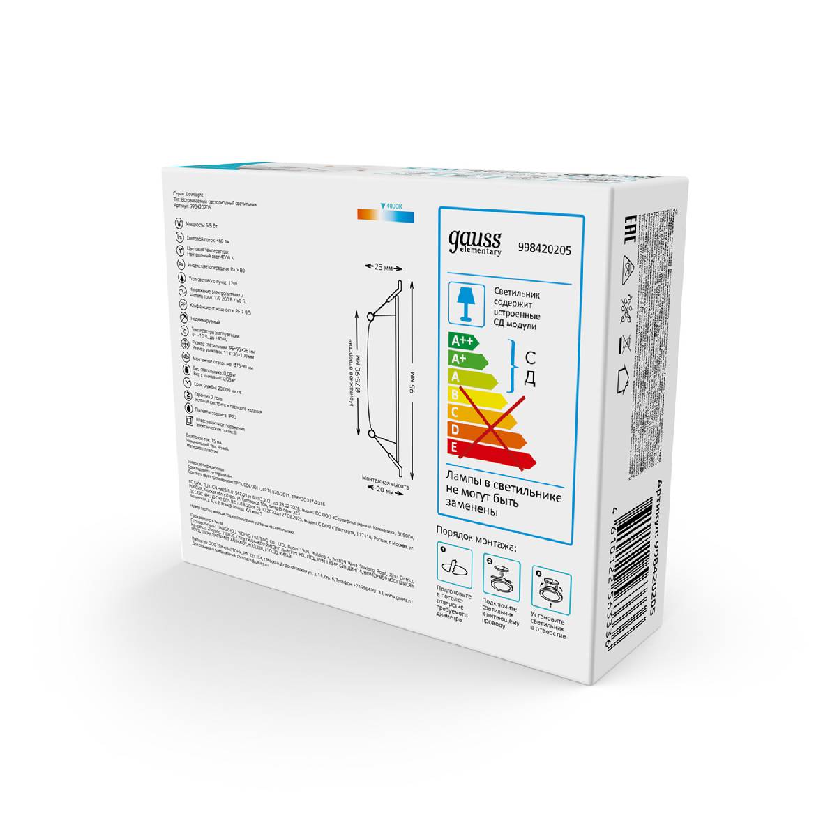 Встраиваемый светильник Gauss Elementary Downlight 998420205Характеристики
