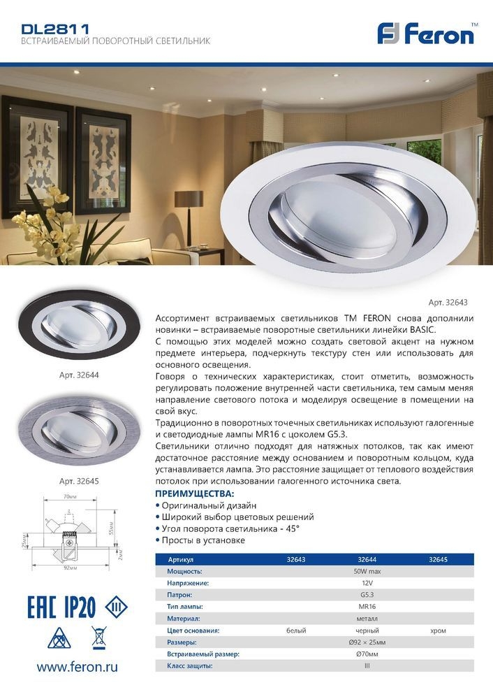 Встраиваемый светодиодный светильник Feron DL2811 32645Характеристики