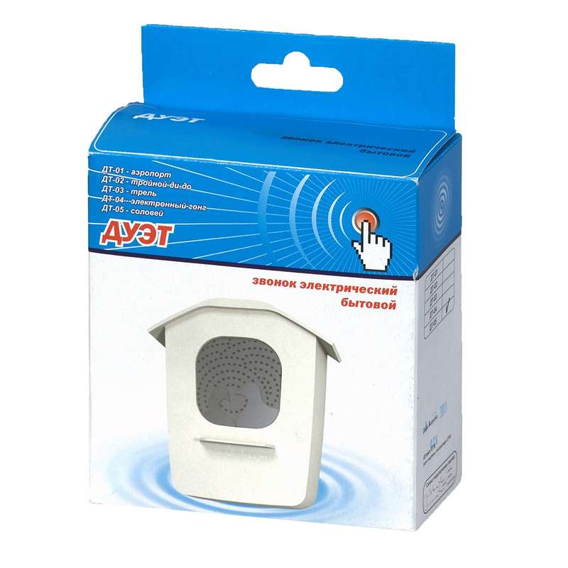 • НАЗНАЧЕНИЕ Звонки бытовые электронные предназначены для подачи сигнала оповещения. • ОБЛАСТЬ ПРИМЕНЕНИЯ Применяются в жилых и офисных помещениях для оповещения присутствующих. Наиболее распространены в жилых многоквартирных домах в индивидуальных квартирах в качестве устройства оповещения о прибытии посетителя. • ПРИНЦИП ДЕЙСТВИЯ Оповещение производится путем нажатия на вынесенную за пределы оповещаемой территории кнопку, соединенную с основным устройством проводной или беспроводной связью. В зависимости от этого звонки бытовые электронные подразделяются на проводные и беспроводные. Подача сигнала основным устройством осуществляется проигрыванием мелодии. Питание устройства и кнопки в зависимости от конкретного устройства осуществляется от заменяемых элементов питания или бытовой электросети 220 В. Конструкция основного устройства основана на полупроводниковой схеме, генерирующей различные звуки и мелодии. Отдельные устройства допускают проигрывание в качестве звукового сигнала музыкального файла в формате mp3 с внешнего носителя информации. • ДОПОЛНИТЕЛЬНЫЕ ПРИНАДЛЕЖНОСТИ ИЛИ АКСЕССУАРЫ В стандартной комплектации, как правило, имеется основное устройство, подающее сигнал оповещения, а также кнопка для дистанционной установки. В зависимости от конкретного устройства возможно наличие в стандартном комплекте поставки элементов питания.Характеристики